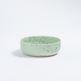 Our Party Collection features a special type of glaze that may exhibit areas where speckles become diffused due to the glass's reactive nature during processing. We find these unique, unpredictable variations to be the most beautiful aspect of the glaze.