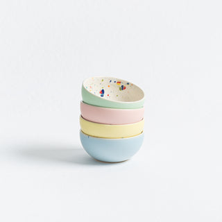 Our Party Collection features a special type of glaze that may exhibit areas where speckles become diffused due to the glass's reactive nature during processing. We find these unique, unpredictable variations to be the most beautiful aspect of the glaze.